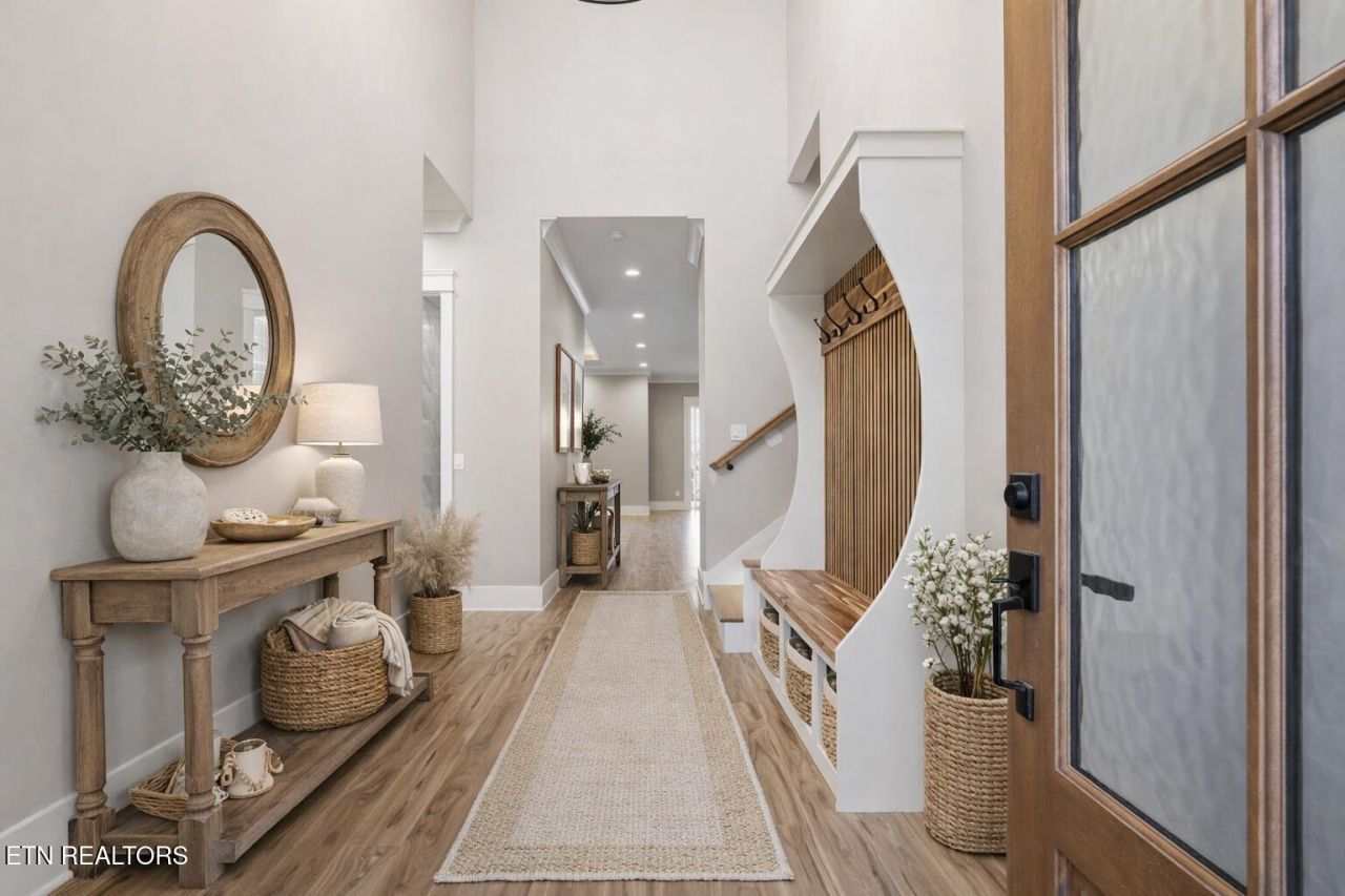 This one truly has it all! Charming new construction featuring 5 bedrooms and 3 full bathrooms with a spacious open layout designed for both everyday living and entertaining. Soaring 20-foot ceiling welcomes you in the foyer, complemented by a double front door and a custom-built drop-off zone, creating a grand yet highly functional entry. Main level features 10-foot ceilings and 8-foot doors throughout, enhancing the open and airy feel. Inviting living room showcases a floor-to-ceiling stone gas fireplace with cabinetry and floating shelves, tray ceiling with accent lighting, and large windows bringing in abundant natural light. Chef's kitchen stands out with a large accent island featuring a waterfall quartz countertop, timeless cabinetry, tiled backsplash, SS appliances (refrigerator, built-in wall oven/microwave, gas cooktop), custom wood hood, wine rack, dry bar with beverage cooler, and generous cabinet space. Main-level primary suite offers a private retreat with tray ceiling and accent lighting. Spa-inspired bathroom features double vanities, freestanding soaking tub, custom tiled walk-in shower, elegant barn door, and spacious walk-in closet. Additional bedrooms provide excellent flexibility for family, guests, or home office space. Beautiful laminate flooring throughout, no carpet. Lighted staircase leads to an oversized upstairs bedroom/bonus room with 9-foot ceilings, walk-in closets, and private full bath. Large laundry room includes cabinetry on both sides and stainless undermount sink, along with an additional drop-off zone by the garage. Oversized 2 car garage with epoxy floors. Outdoor living shines with a covered stamped concrete front porch, screened-in deck with tongue-and-groove ceiling, adjoining open composite deck, and large concrete patio for entertaining. Encapsulated walkout crawlspace offers excellent potential for storage or workshop space. Quality craftsmanship, thoughtful design, and modern finishes throughout make this home truly move-in ready! Schedule your showing today. Buyer to reimburse Seller at closing the one-time Loudon County Impact tax 1.00 dollar per finished sq.